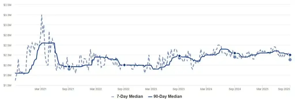 The median list price is $2.13M, while the median price of new listings is lower at $1.70M. This gap suggests that sellers bringing homes to market are often pricing more competitively than existing listings, an indication that they’re responding to buyer sensitivity and market conditions.