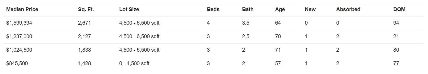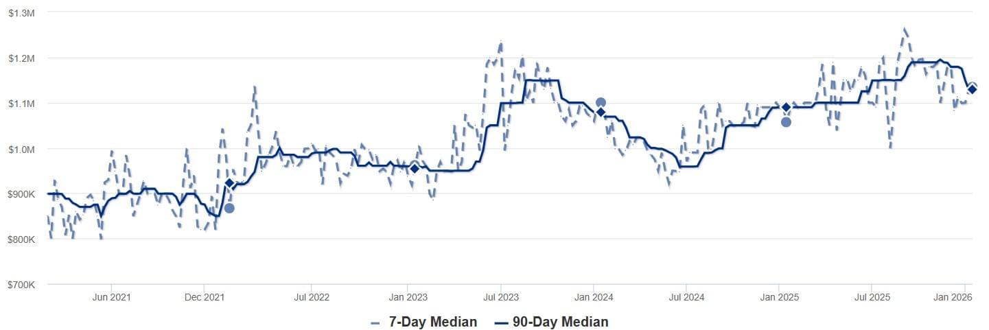 The median list price is $1.134M, while the median price of new listings is lower at $1.050M. This gap has tightened up significantly over the last month, suggesting that sellers bringing homes to market are pricing homes more competitively than existing listings, but not by much. This can be an indication that they’re responding to buyer sensitivity and market conditions, but both figures have slightly declined compared to last month.