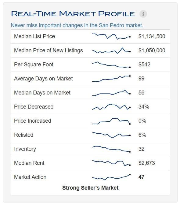For December 2025, the median list price for San Pedro is $1,134,500, with the Market Action Index (MAI) at 47—a slight seller’s advantage. Inventory is at 32 active homes, which has been trending down in the last few months.